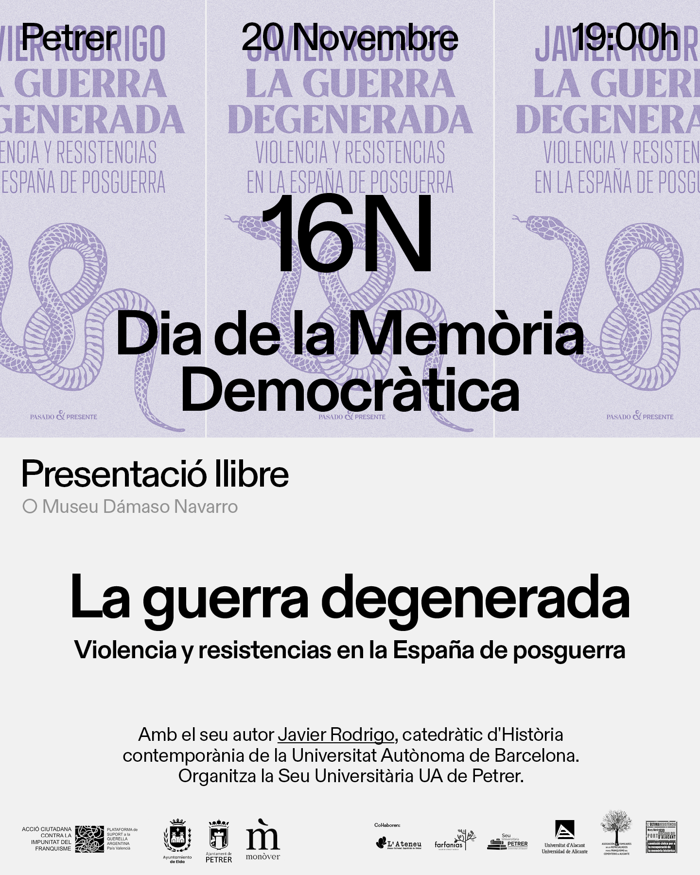 El Museo Dámaso Navarro de Petrer acogió a Javier Rodrigo , uno de los mejores historiadores especialistas en la guerra de España, las políticas de violencia y sus relatos. Habló de La guerra degenerada Merece la pena conocer su obra (ver: https://es.wikipedia.org/wiki/Javier_Rodrigo). El acto fruto de la colaboración con la sede de la UA fue presentado por el profesor de historia Pedro Payá.