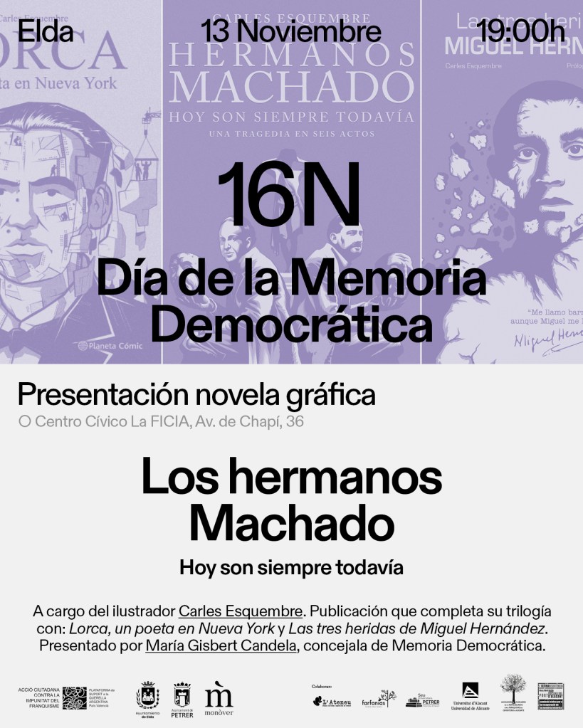 En el Centro Cívico FICIA de Elda cita con Carles Esquembre, autor de la novela gráfica Los hermanos Machado, que termina con esta obra su trilogía sobre Lorca, Miguel Hernández y ahora los Hermanos Machado. Poetas cuya voz quiso callar para siempre la larga noche franquista. Voz que hoy sigue con más fuerza clamando libertad y justicia. María Gisbert concejala de Memoria Democrática de Elda presentó el acto.