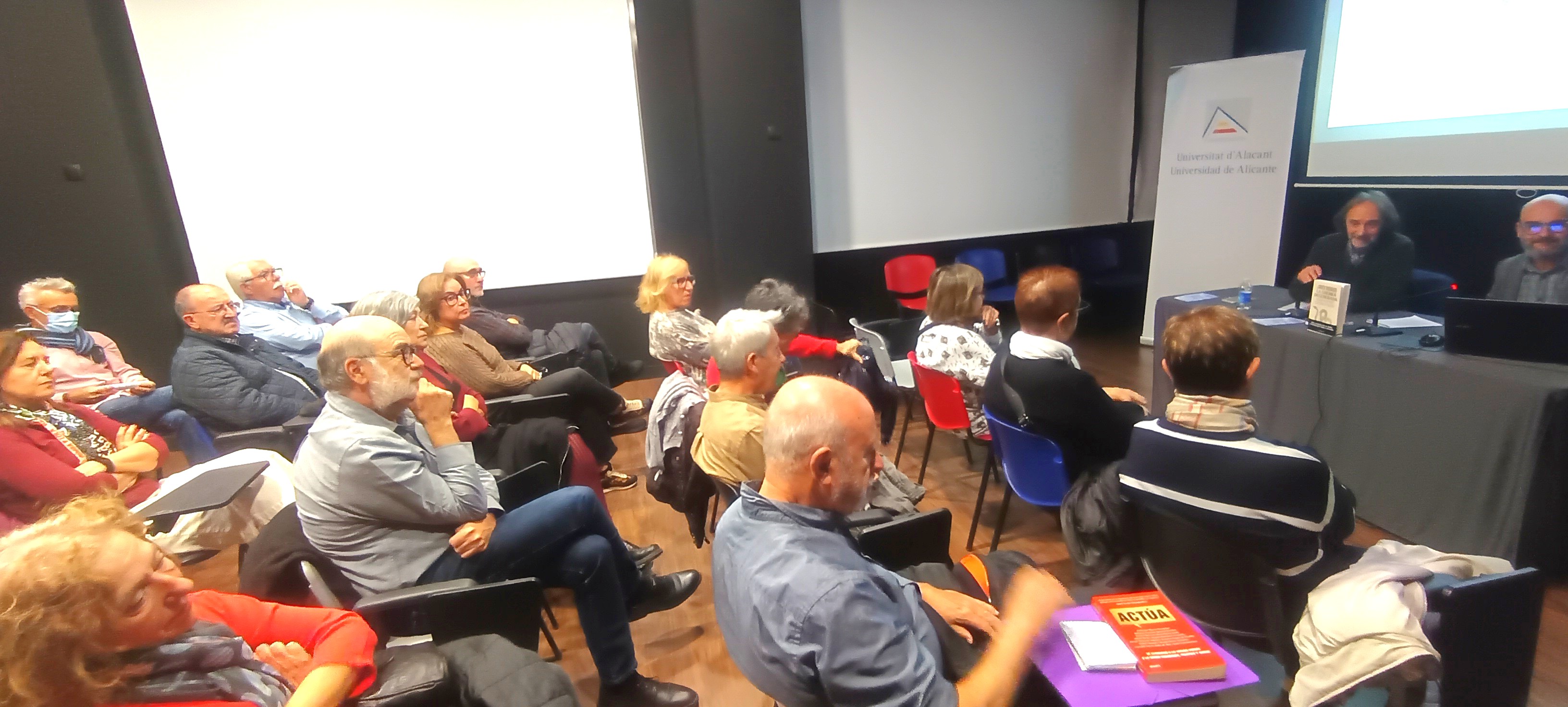 8 de mayo de 2025 Sede Universitaria de la UMH en Elx. Con Miguel Orts director Cátedra Pedro Ibarra, Elías Alonso, Martín Carpena y Carmen Palomar de CCOO, Javier Falcó realizador documentales, entre otras personas.