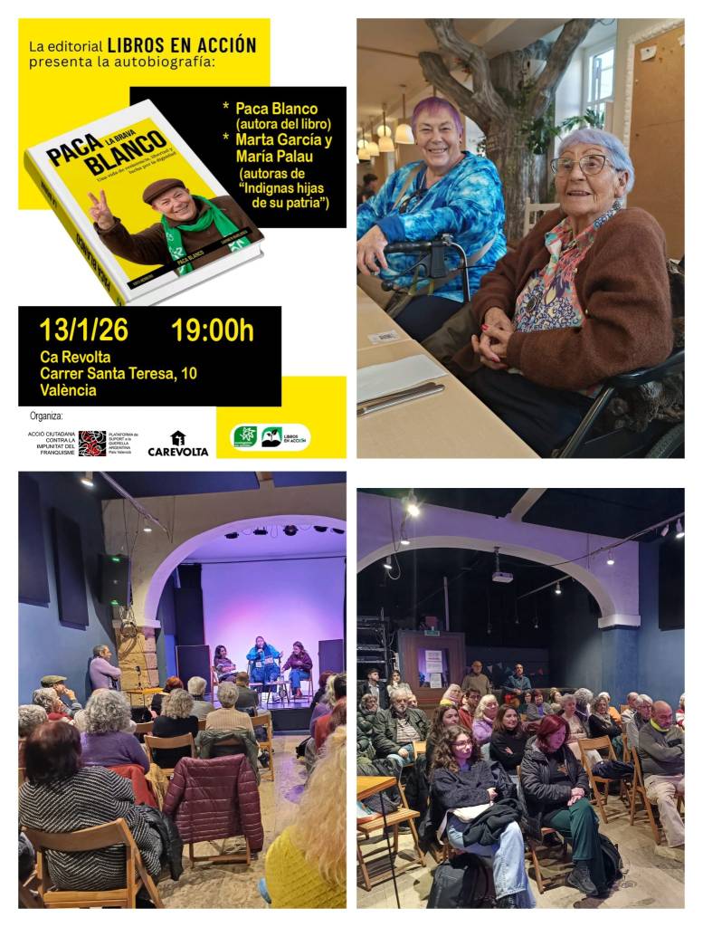 Paca ha estado acompañada en la presentación por Marta Garcia y María Palau, autoras de Indignas hijas de su patria, investigadoras del Patronato de Protección a la Mujer y referentes en la reciente divulgación de esa institución franquista contra las mujeres.