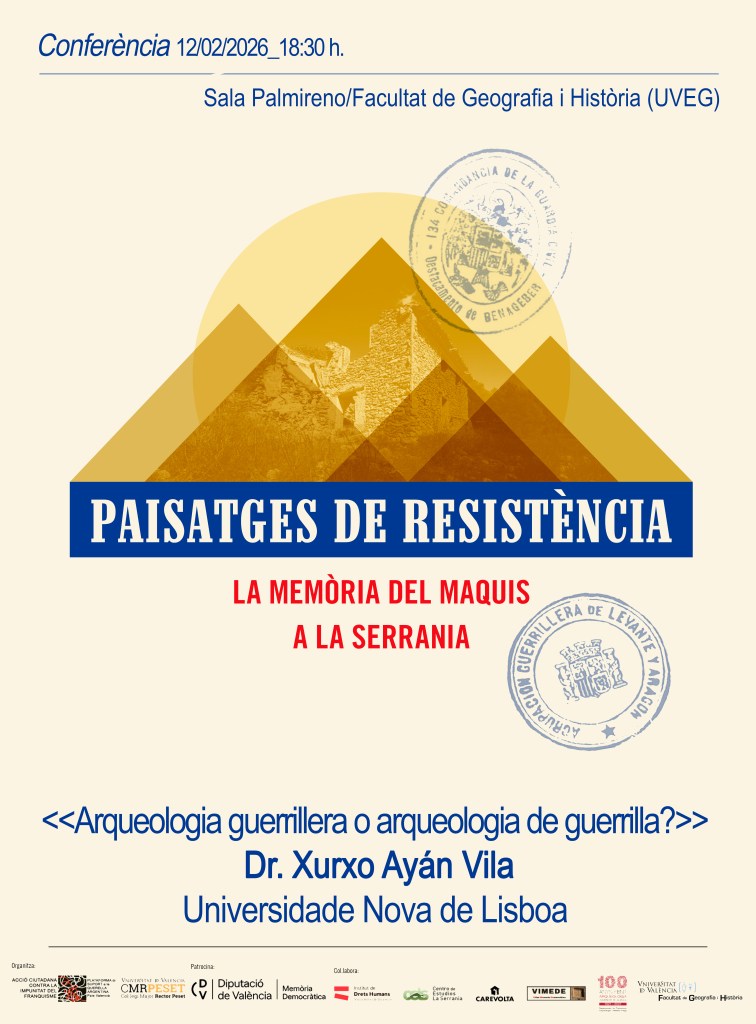 Aquesta conferència forma part del cicle desenvolupat en el projecte Paisatges de Resistència. El maquis en La Serranía, finançat per l’Àrea de Memòria de la Diputació de València, en el qual col·labora també el Departament d’Arqueologia de la Facultat.