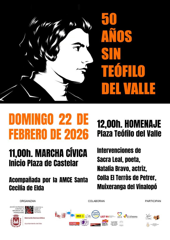 22 de febrer, marxa cívica a Elda en memòria de Teófilo i les persones que van lluitar per la democràcia. A les 11 hores Plaza de Castelar