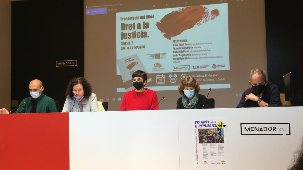 El dia 12 realizamos la presentación en el espacio cultural el Menador de la Universitat Jaume Primer de Castellón. Presentó el acto Maribel Peris, del Grup per la Recerca de Memoria Histórica de Castelló y miembro del Consell de Cultura del Pais Valencià, intervinieron Lucila Aragó, querellante por torturas, en representación de Acció Ciutadana contra la Impunitat del Franquisme, Antoni Antoni Balançà familiar de las fosas de paterna y querellante, Rafael Juarez querellante por torturas y Aradia Ruiz, abogada de la Cooperativa el Rogle, representate legal de los querellantes.