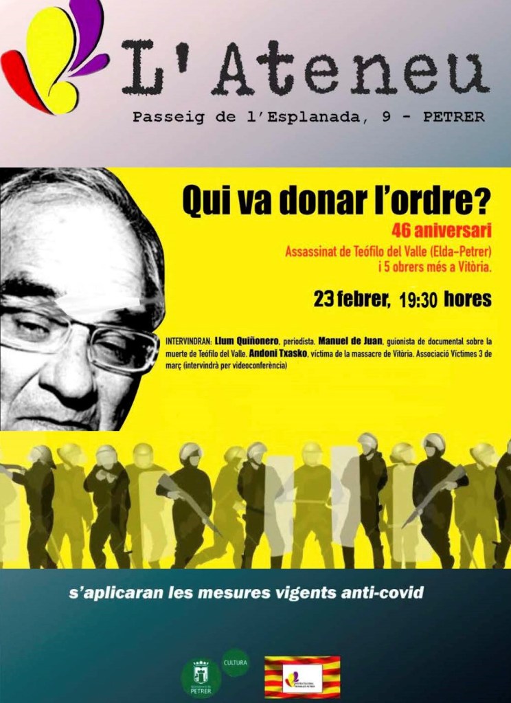 En el aniversari del assasinat de Teófilo del Valle el recordarem a Petrer el 23 de febrer Imagen Posted on 11 febrero, 2022 por querellapv Comparte: Haz clic para compartir en X (Se abre en una ventana nueva) X Haz clic para compartir en Facebook (Se abre en una ventana nueva) Facebook Me gusta Cargando...