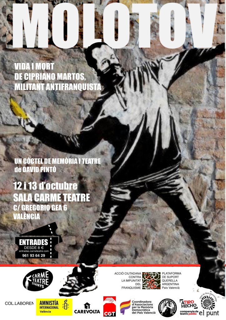 Els dies 12 i 13 d’octubre a la sala Carme Teatre de València, es representarà l’obra de teatre “Molotov”. Vida i mort de Cipriano Martos, militant antifranquista. Dirigida per David Pinto i interpretadaper Joan Valentí Cortés “Nan” i Montse Pelfort Valentí.