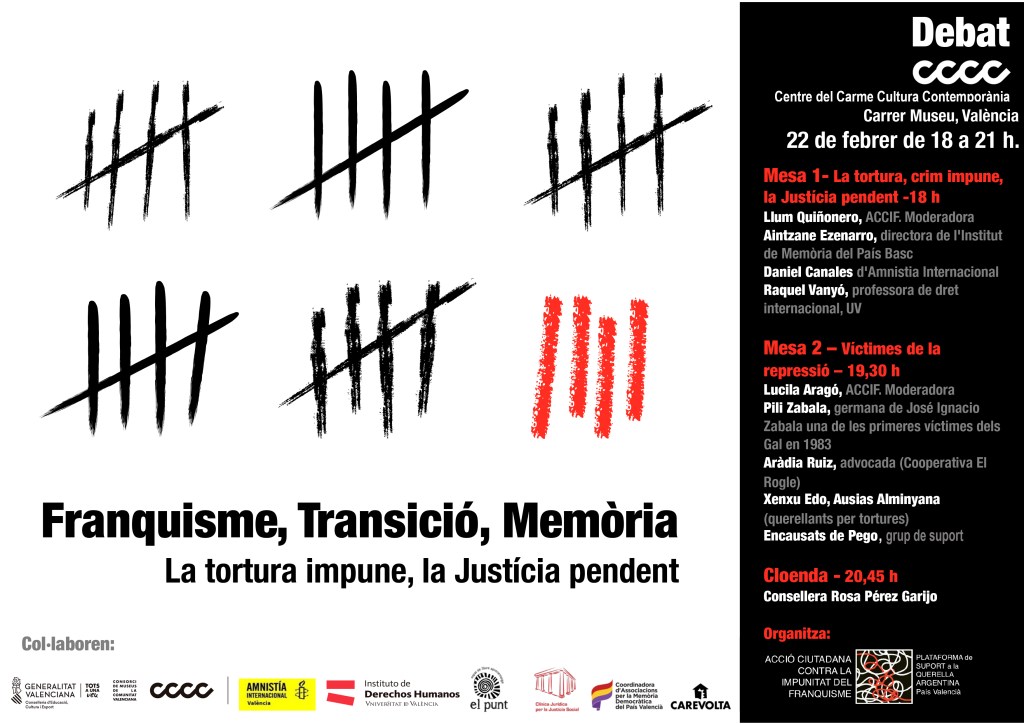 amb la col·laboració de: Amnistia Internacional, Institut de Drets Humans de la Universitat de València, la Clínica Jurídica de Justícia Social, Coordinadora de Associacions per la Memòria Democràtica, El Punt (Centre d’autoaprenentatge) i Ca Revolta.