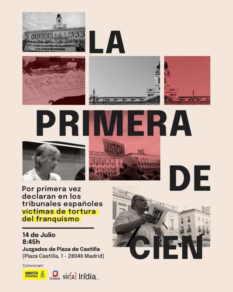 Después de 100 querellas presentadas, el 14 de julio un querellante por crímenes del franquismo y un testigo declaran en los tribunales españoles. Por 1a vez en el Estado español, se inicia una investigación por un crimen de tortura en contexto de crimen contra la humanidad: ¡es un día histórico y queremos que se trate como tal!