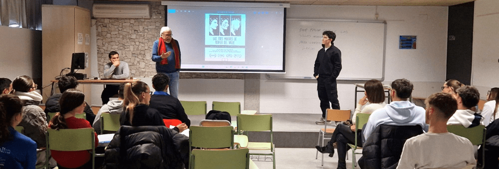 Durante el mes de febrero de 2025 hemos realizado una serie de proyecciones de Las Tres Muertes de Teófilo del Valle en varios institutos de Elda con los alumnos y alumnas de segundo de bachiller. Yo asistí en calidad de director del documental y debía participar en el debate porterior. La primera proyección fue en el IES de La Melva. Despues el IES Monastil y el IES La Torreta. A estos dos últimos fuí acompañado de mi hijo Manel, pues le apetecía volver al lugar donde había estudiado el bachiller, hablar de su participación en el documental y ver cómo reaccionaban los que ahora tienen los mismos 16 o 17 años que él tenía cuando pisaba estas aulas.