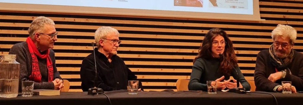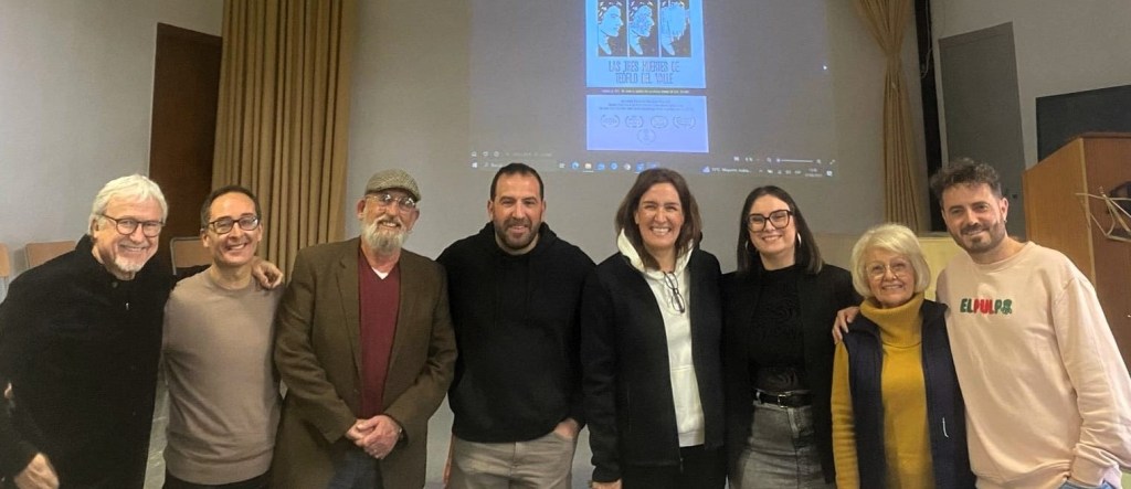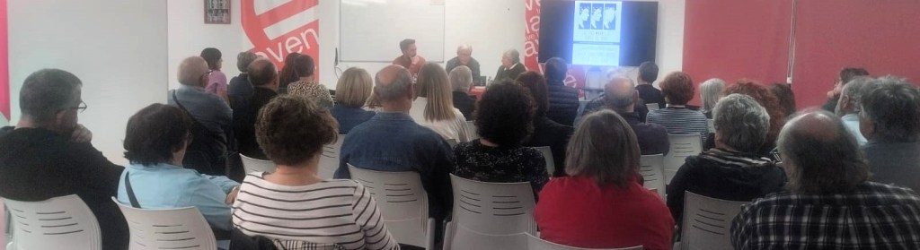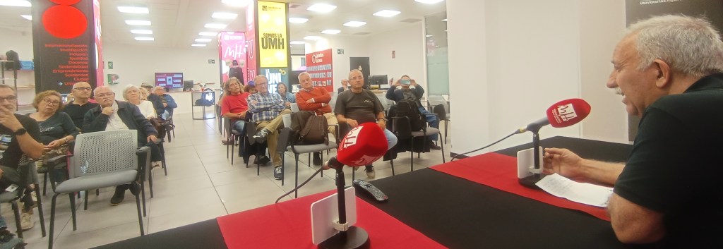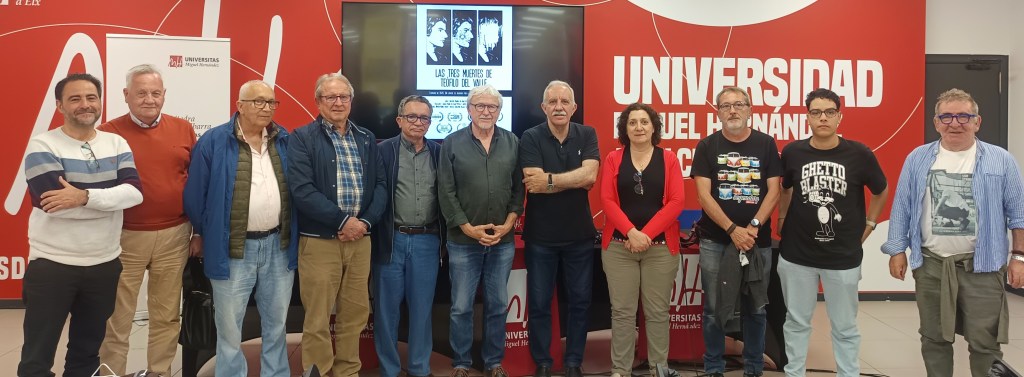 8 de mayo de 2025 Sede Universitaria de la UMH en Elx. Con Miguel Orts director Cátedra Pedro Ibarra, Elías Alonso, Martín Carpena y Carmen Palomar de CCOO, Javier Falcó realizador documentales, entre otras personas.
