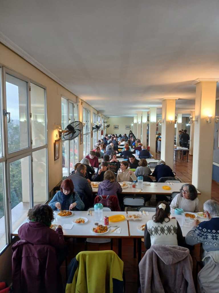Després de fer una ullada a les casamates del pantà, ja haviem fet gana i voliem entrar en calor. La calefacció i l’envidriat del menjador del centre de vacances ens va donar l’oportunitat de dinar una saborosa paella gaudint d’unes vistes privilegiades del pantà. En acabar, i aprofitant que la pluja ens va donar una treva, Joan ens va conduir a l’indret dels barracons on va ser allotjat el destacamenrt penitenciari.