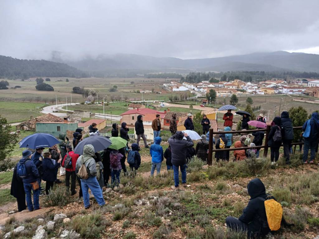 Amb fred i pluja, vam fer la primera parada de la ruta a l’entrada del llogaret de Nieva, molt a prop del poble de Benagéber. Era l’indret idoni per parlar sobre la resistència guerrillera en la comarca, ja que allà es troba el solar de Casa Paquita, coneguda per ser un punt de suport del maquis i que, a més, va estar involucrada en els tràgics successos que van acabar amb 8 assassinats per part de la guàrdia civil, soterrats en una fossa comú. Els coneguts com “los 8 de Benagéber”. En eixe paradigmàtic paratge i amb la vista panoràmica de Nieva i Benagéber, Joan Salazar i Elena Trabajo ens van explicar característiques i funcionament de l’AGLA en la comarca i, sobre tot, cóm sobrevivien els guerrilers gràcies a la col.laboració dels pagesos de la zona i d’alguns obrers del pantà.