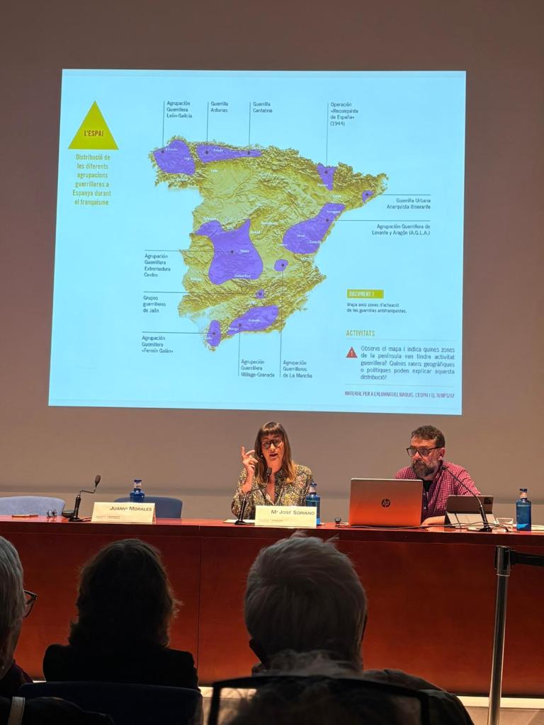 Juanvi Morales i María José Soriano, profesors d’Historia i autors dels materials didàctics van explicar l’esforç realitzat per a traslladar a l’estudiantat de l’ESO i de batxiller este període del franquisme. Un temps en el qual s’entrecreuen molts elements que marquen la política internacional i un territori en el qual es duu a terme una dura batalla, resistència i polítiques repressives d’extermini.