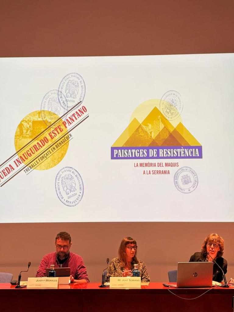 Lucila Aragó, que ha coordinat des de Acció Ciutadana contra la impunitat del franquisme (ACIF) este projecte, va introduir la conferència, realitzant un resum de les activitats desenrotllades des de 2024; primer amb la proposta Queda inaugurado este pantano. Treballs forçats a Benagéber, ara amb Paisatges de Resistència, la memòria del maqui en la Serrania. Una activitat investigadora i divulgativa intensa y molt interessant. Que ha sigut possible amb el patrocini de l ‘Àrea de Memòria Democràtica de la Diputació de València, la coorganización amb el Col·legi Major Rector Peset i la col·laboració d’altres entitats com el Departament d’Arqueologia i l’Institut de Drets Humans de la Universitat de València, CELS, VIMEDE de Villar i Ca Revolta.