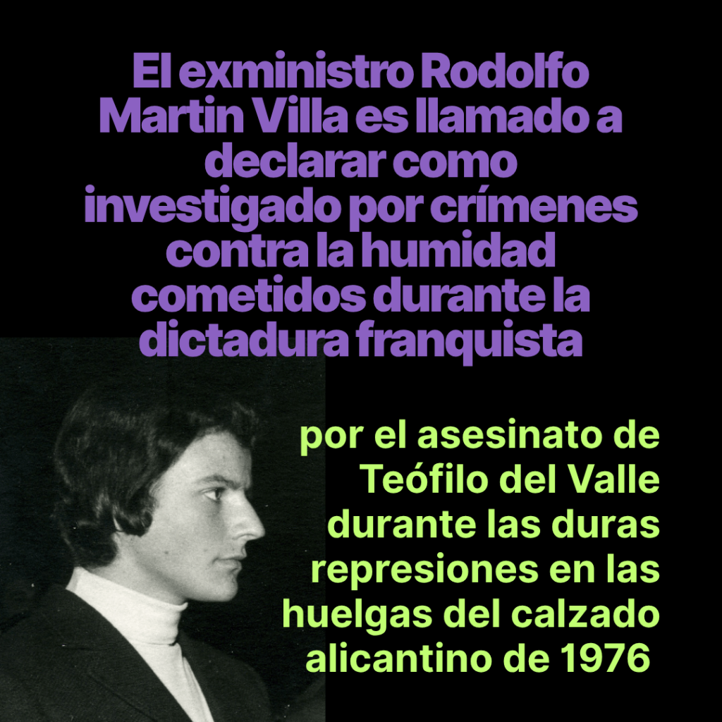 - L’exministre franquista Rodolfo Martin Villa i el membre de la policia armada Daniel Aroca del Rey, que estàn sent investigats en el Jutjat de Primera Instància i Instrucció Núm. 1 d’Elda, han sigut citats a declarar per l’assassinat, en un context de crims contra la humanitat, de Teófilo del Valle durant les dures repressions en les vagues del calçat alacantí de 1976.
