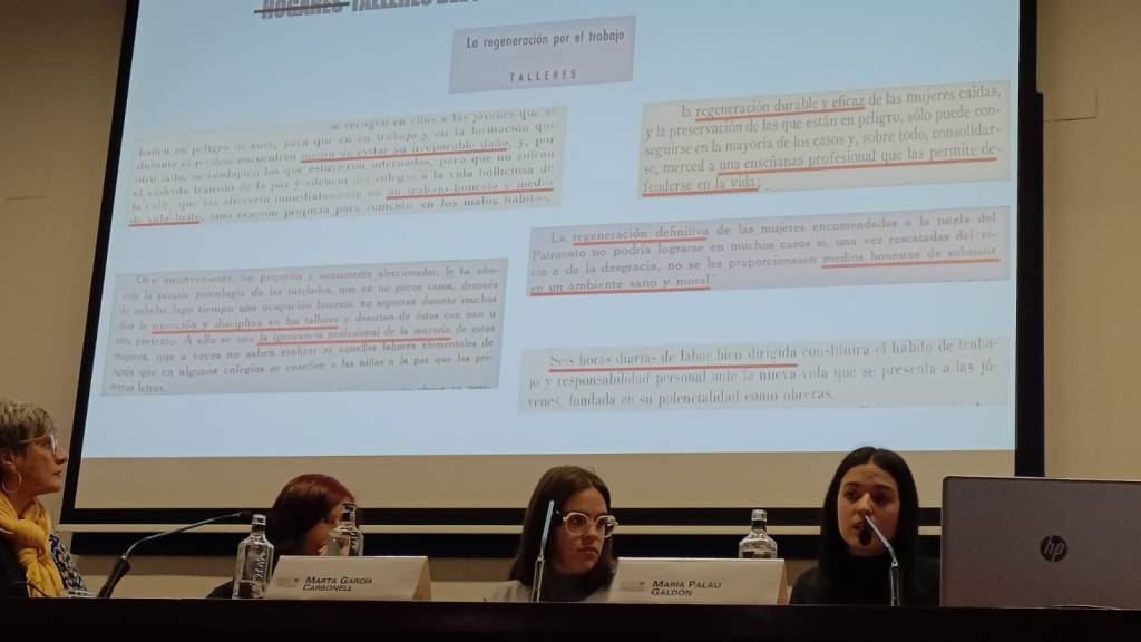 El 9 de diciembre hemos realizado en València, Colegio Mayor Rector Peset, una conferencia con Pilar Iglesias, Maria Palau y Marta Garcia Carbonell sobre el trabajo en el Patronato de Protección a la mujer, moderado por Llum Quiñonero. Todas ellas son investigadoras de este tema y han publicado sobre ello. En sus intervenciones mostraron los rastros sobre los talleres que había en los centros del Patronato, lo que sobre ellos han encontrado en la documentación y en los testimonios de mujeres recluidas en la institución.