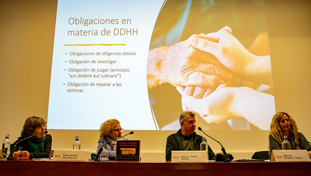 Raquel Vanyó, professora de dret internacional de la Universitat de València va exposar des del punt de vista jurídic la vulneració de drets humans que aquests crims representen. La legislació que existia i existeix per a reclamar que siguin investigats i enjudiciats els responsables. Una via necessària per a reparar a les víctimes. Que a Espanya la majoria de la judicatura no considera per als crims franquistes, quan si l’ha aplicat per a altres criminals de lesa humanitat, com és el cas de militar argentí Scilingo jutjat i condemnat en 2004 per l’Audiència Nacional.