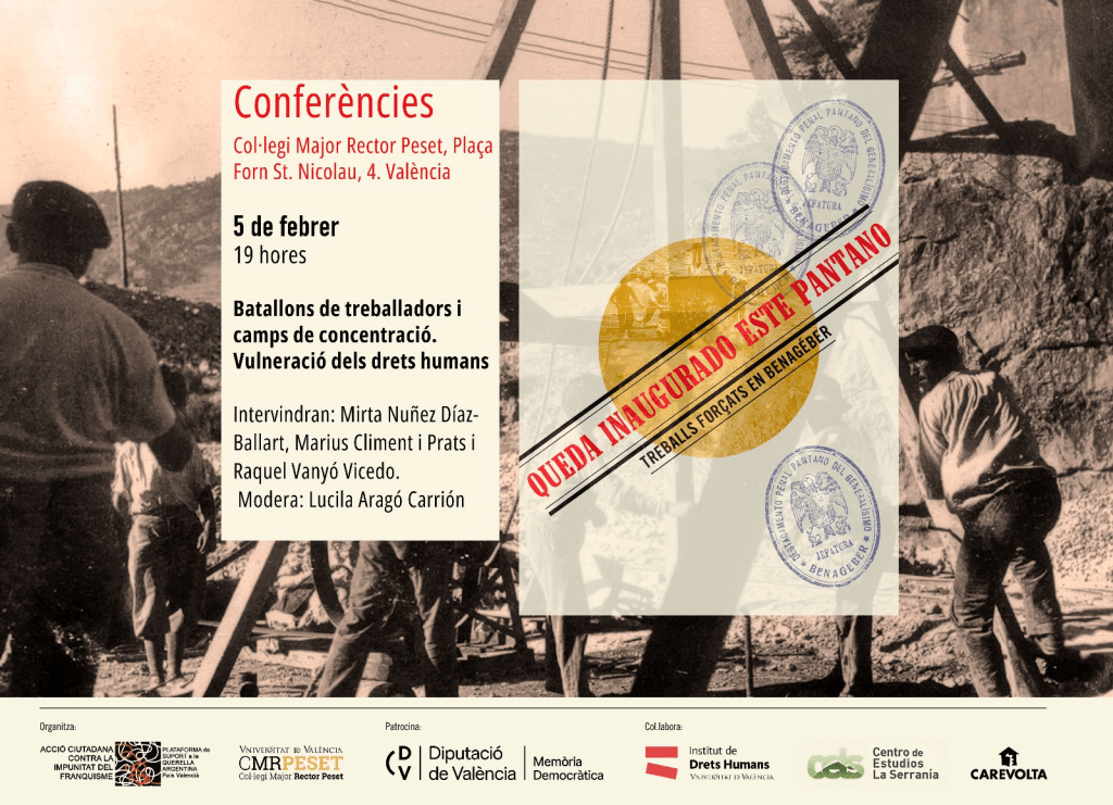 El 5 de febrer realitzàrem al Col·legi Major Rector Peset de València la conferència que havíem hagut d’ajornar per la Dana el passat 30 d’octubre. Vam parlar dels batallons de soldats i els camps de concentració on els franquistes van recloure a desenes de milers de republicans, espais als quals es van generalitzar els treballs forçats i l’esclavissme. Marius Climent, catedràtic de geografia i Història i autor del llibre “El treball esclau durant el franquisme. La Vall d’Albaida (1938-1947)” va explicar els origenes dels batallons de treballadors. Els sistemes de classificació establerts pels franquistes en els quals, de manera totalment arbitrària, es va titllar de «desafectos» al règim a desenes de milers de soldats republicans, recloent-los en uns batallons que van realitzar multitud d’obres de fortificació i reconstrucció. Uns presos que malvivien dins d’una estructura absolutament corrupta en la qual es robava des del presupost per a alimentar als reclusos fins als paquets de menjar que, amb tant d’esforç travaven de fer arribar les famílies, les dones de les famílies, per a alleujar la fam dels presos.