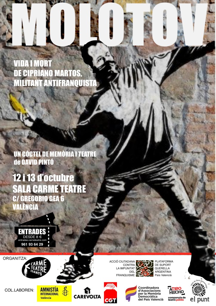 Estimadas compañeras y compañeros estamos preparando para los días 12 y 13 de octubre la representación en Carme Teatre de la obra Molotov. Vida i mort de Cipriano Martos militant antifranquista. Que denuncia el asesinato en 1973 de Cipriano, murió a consecuencia de las torturas, en Reus la guardia civil le hizo beber un coctel molotov moría unos días después, su cuerpo fue arrojado a una fosa común.