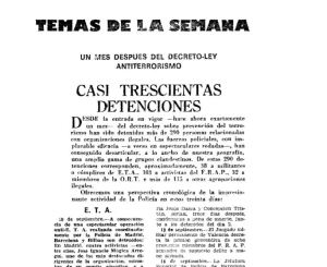 El diario “Informaciones” daba cuenta el mismo 27 de septiembre, de que en un mes de aplicación del Decreto-Ley se habían realizado más de 300 detenciones contra personas acusadas de pertenecer a, FRAP, ORT, ETA VI Asamblea, Unión do Povo Galego, Partido del Trabajo de España, Joven Guardia Roja, Movimiento Libertario Español (M.L.E.), Movimiento Comunista de España, Partido Revolucionario de España, ETA, Comando Obrero de Acción Revolucionaria y del Front d’Alliberament Catalá. Por su parte, el periódico Le Monde de esa misma fecha informaba de la detención, días antes de las ejecuciones, de 35 militantes del PTE en Zaragoza que preparaban acciones de protestas, también del encierro de 50 abogados en Barcelona y más detenciones en Gijón, Vigo y Bilbao. El periódico ABC, de 21 de septiembre, lleva en portada la noticia de la detención de 53 personas en València y Barcelona pertenecientes a organizaciones ilegales. Este clima de detenciones cesará su intensidad con la muerte de Franco en noviembre de ese año. Fueron decenas de miles los y las presas políticas que se beneficiaron de los indultos y amnistías decretados tras la desaparición de Franco, en noviembre de 1975, julio de 1976 y marzo de 1977.